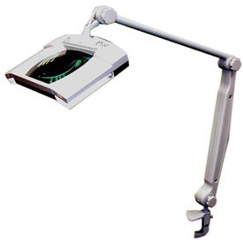 Magnifying Desk Lamp Magnifying lens provides 3 diopter of magnification, measures 7"L x 5-1/2"W and illuminates with two 7 watt compact fluorescent bulbs. Balanced arm features a concealed spring and measures 47"L. Beige color. UL listed. 26.50 L. 8.83 W. 5.13 H.
