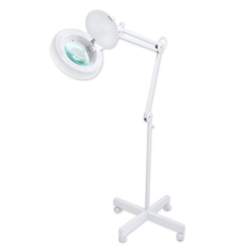An outstanding value in a premium-quality task light for professional, home and hobby use. Weighted 4-leg roller stand provides excellent stability; 30" fixed-height with 34" flex-arm gives you standing/sitting positioning options plus reach over obstacles. Convenient power switch on lamp head, dust cover protects and keeps lens clean when not in use. Low-maintenance Classic White finish. 60" 3-prong power cord, UL-listed. Also available in 8X-power.